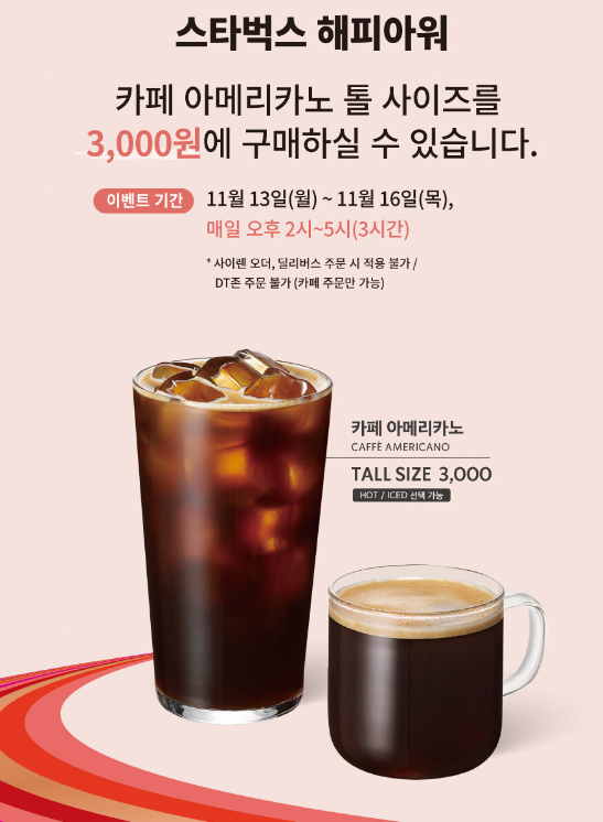 스타벅스 쓱데이 해피아워 진행으로 아메리카노 3000원에 즐길수 있다고 합니다.