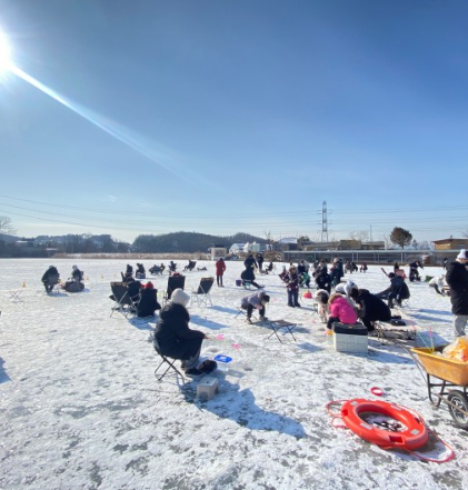 넓은 저수지가 얼음으로 꽁꽁 얼어 있는 곳을 구멍을 내어 빙어 낚시와 얼음 썰매도 즐길수 있는곳 입니다.