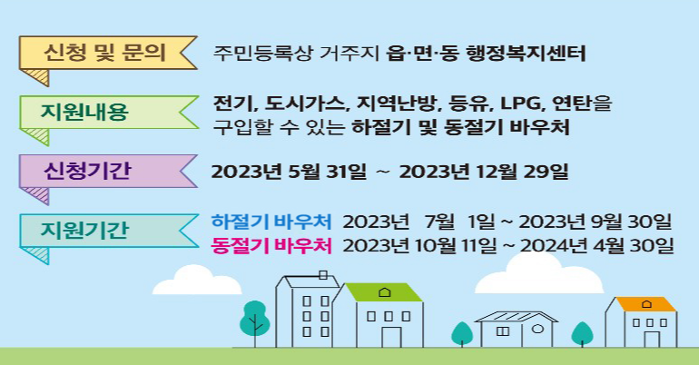 | 겨울바우처 | 23.10.11 ~24.04.30 | -요금차감 : 전기, 도시가스, 지역난방 중1개 -국민행복카드 : 등유, LPG, 연탄, 전기, 도시가스 |