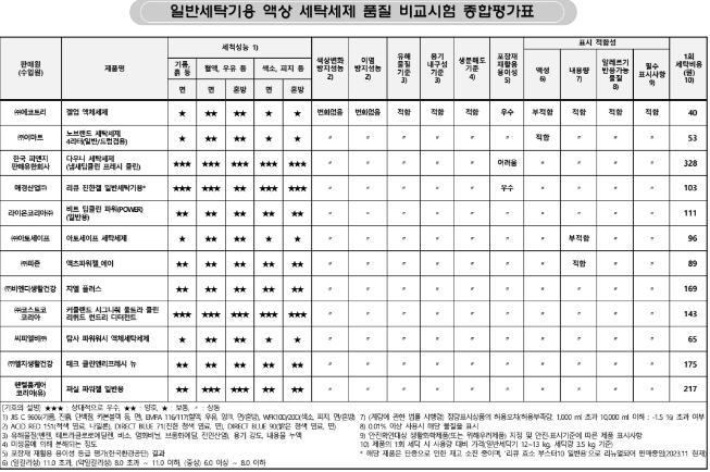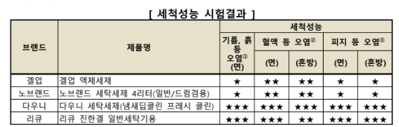 또한, 혈액, 잉크 등 잘 지워지지 않는 얼룩은 다우니 세탁세제, 커클랜드 시그니처 울트라 클린 액체세제, 퍼실 파워젤 일반용(헨켈홈케어코리아)이 면과 혼방 소재 모두에서 상대적으로 우수한 성능을 보였고, 리큐 진한겔 일반용은 면에서는 '우수', 혼방 소재에서는 '양호'한 것으로 확인 되었습니다.