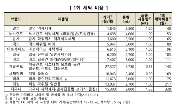 특히 세탁물 3.5㎏을 세탁할 때 필요한 세제 양을 기준으로 세탁 1회에 소요되는 비용을 조사한 결과, 겔업 액체세제는 40원인 반면 다우니 세탁세제는 328원으로 제품 간 최대 8.2배 차이가 났다.