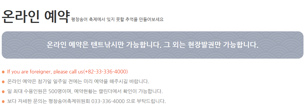 송어축제 얼음낚시 텐트는 온라인으로만 예약이 가능 합니다. 좌석이 있을 경우만 현장 발권이 가능한데 현장 발권이 생각보다 어려워 미리 온라인으로 예매 하시길 바랍니다.