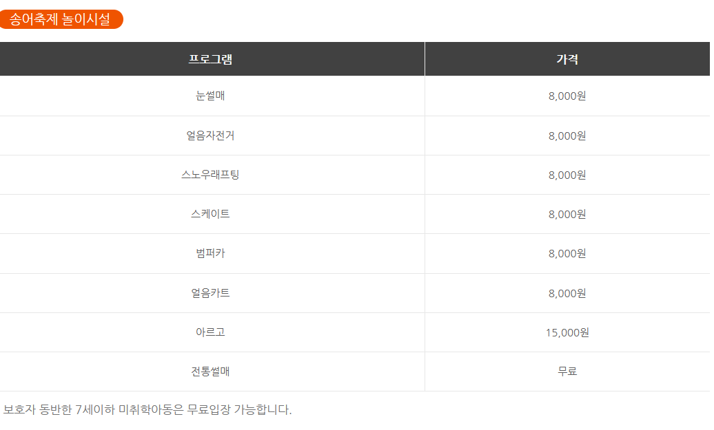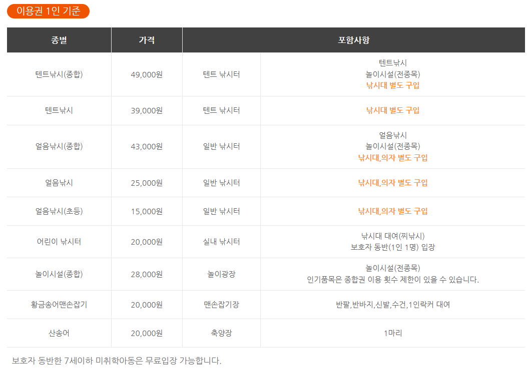 하나하나 개별적으로 가격을 보시는것보다 얼음낚시텐트 종합권이나 놀이시설 종합권이용시 훨신더 저렴하게 많이 이용할 수 있습니다.