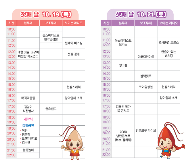 대형 젓갈 및 고구마 비빔밥 퍼포몬스, 북콘서트, 핑크퐁공연, 버스킹등 다양한 볼거리 열기구 체험, 맛깔젓 레시피 경연까지 알찬 축제 구경 하러 오이소!