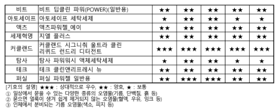 먼저 일상생활에서 발견할 수 있는 기름때, 먼지 등 오염물질의 세척성능을 시험한 결과, 다우니 세탁세제((주)한국피앤지, 오더 딥 클린 프레쉬 클린), 커클랜드 시그니처 울트라 클린 액체세제(코스트코 코리아), 일반세탁기용 리큐 진한겔(애경산업㈜)이 상대적으로 '우수'함