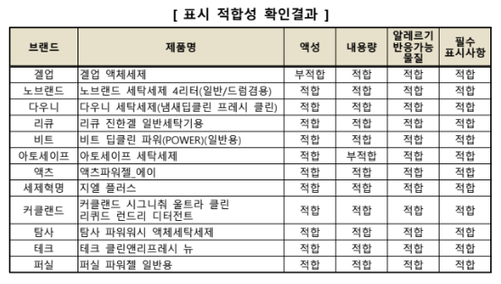 한국소비자원의 표시 적합성 확인 결과, 젤업 액체세제(에코트리)는 '약알칼리성'이 아닌 '알칼리성'으로, 아토세이프 세탁세제(아토세이프)는 함량이 표시된 양보다 적어 관련 기준에 부적합한 것으로 나타났다.