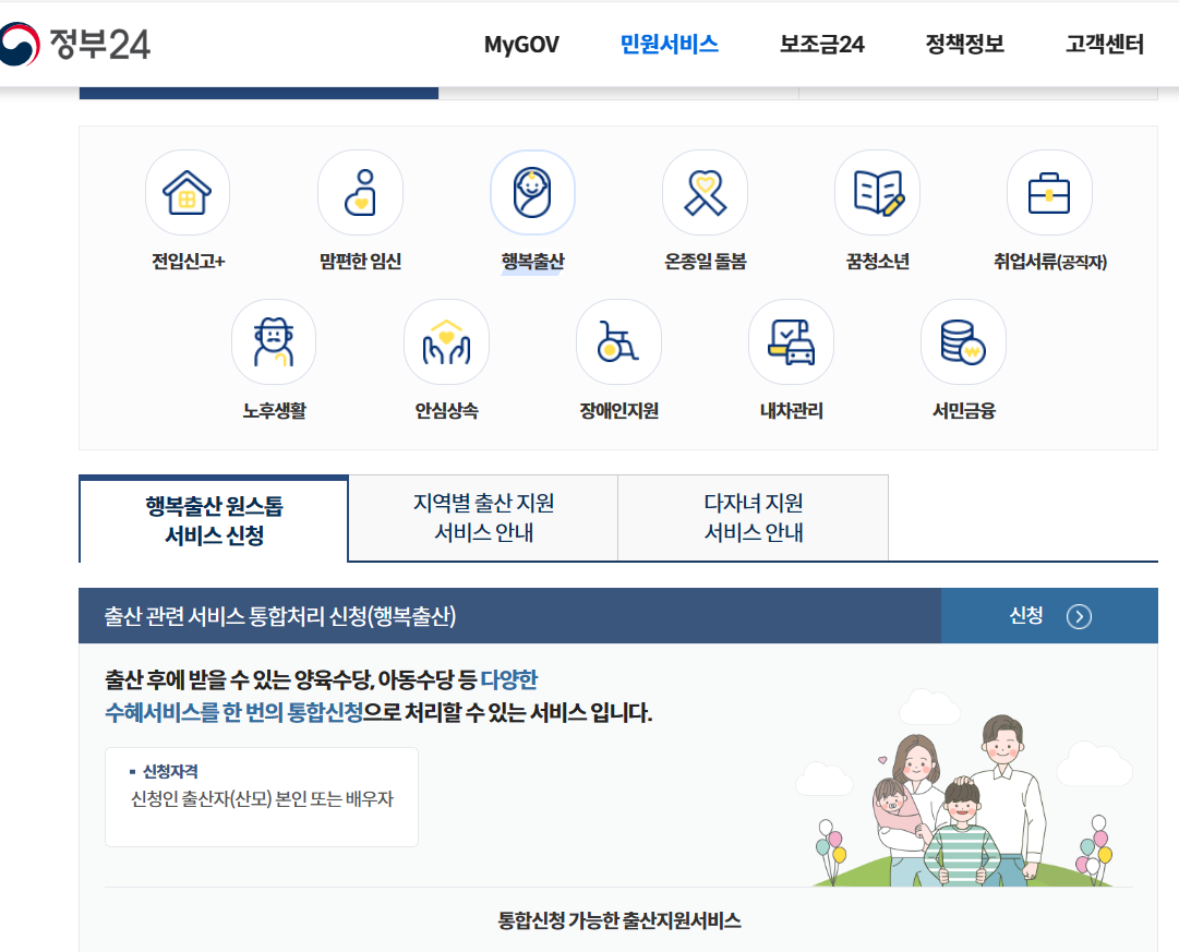 정부24 > 행복출산 원스톱 서비스 신청 > 로그인 > 신청